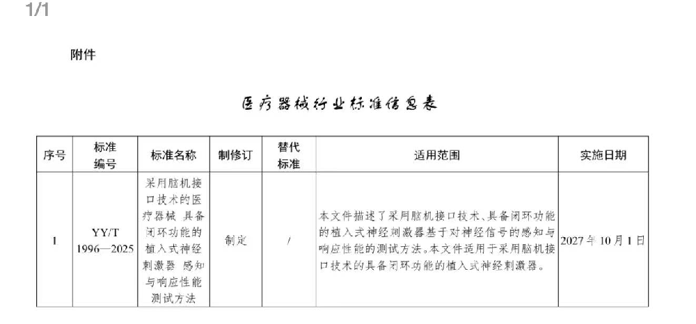 國家藥監局關于發布YY/T 1996—2025《采用腦機接口技術的醫療器械 具備閉環功能的植入式神經刺激器 感知與響應性能測試方法》醫療器械行業標準的公告(···
